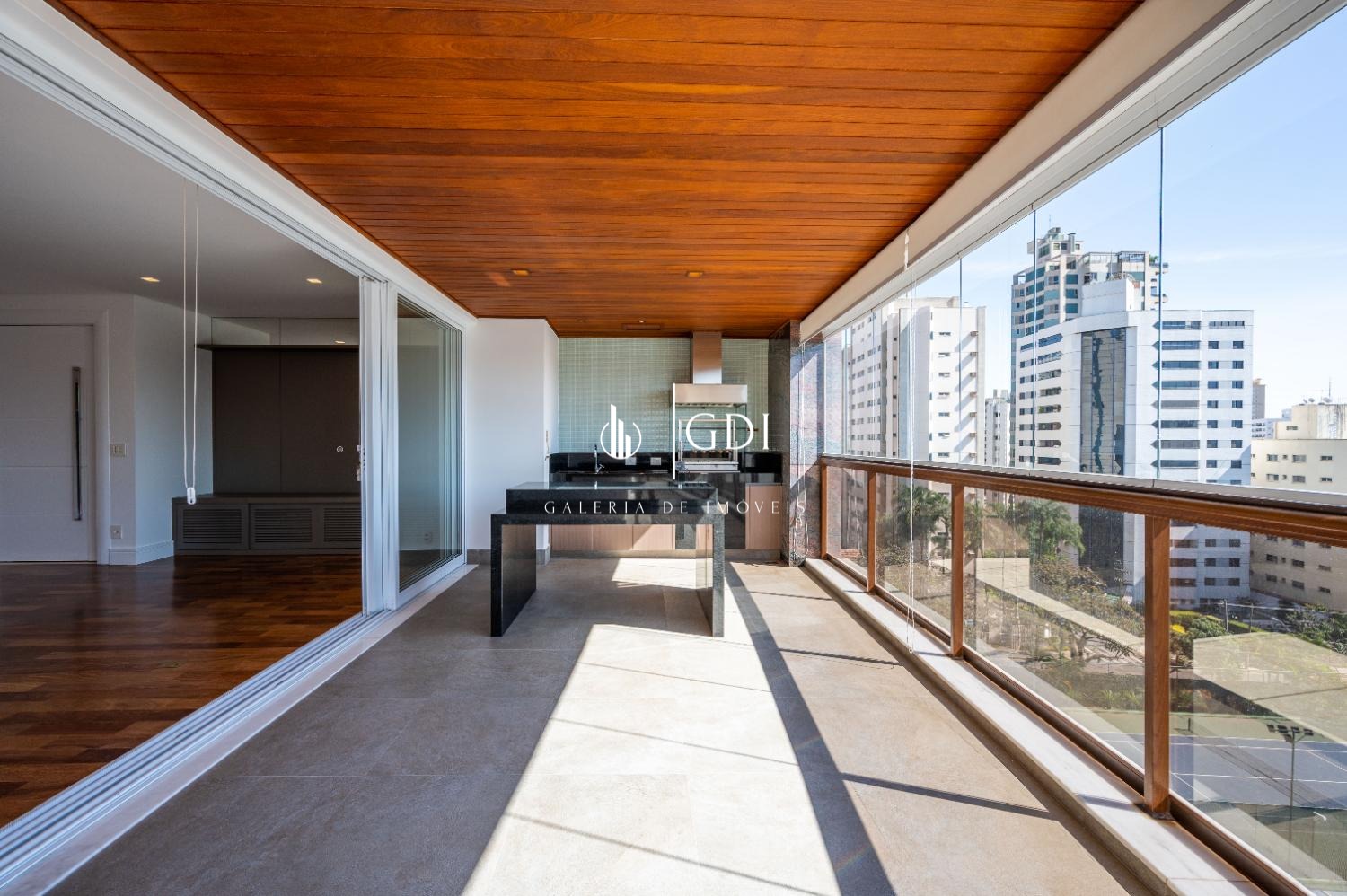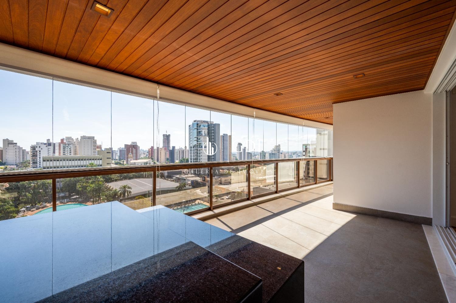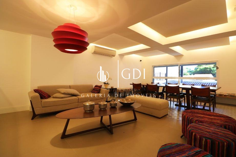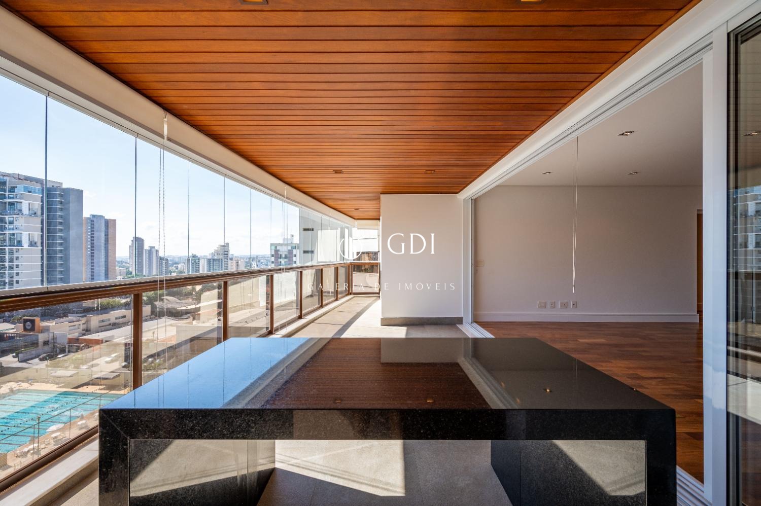 Os acabamentos reforçam o padrão elevado do imóvel, com piso em tábua corrida, teto rebaixado em gesso com iluminação indireta e ar-condicionado central, proporcionando conforto térmico e sofisticação em todos os ambientes.