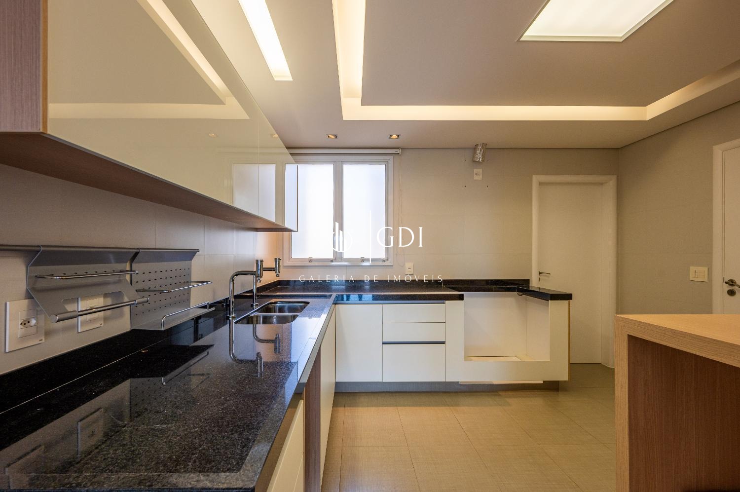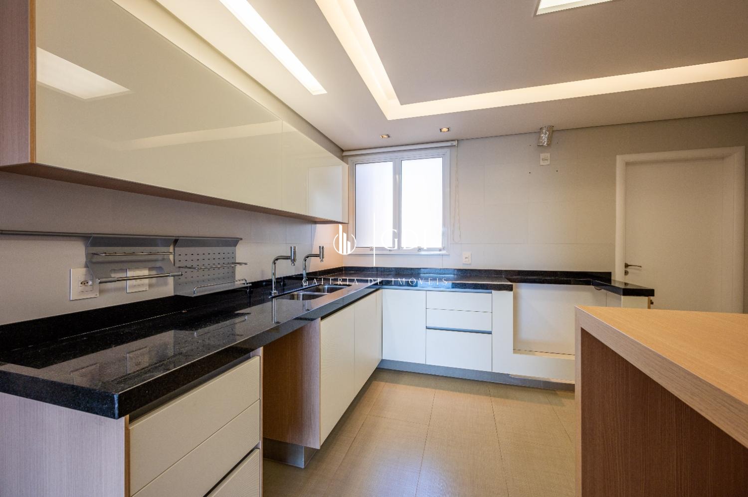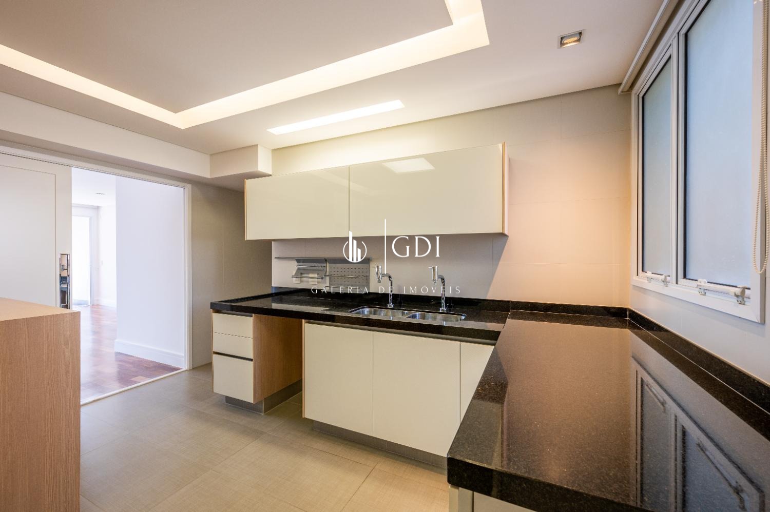 A cozinha planejada da renomada marca Kitchens é equipada com armários, fogão, forno, cuba dupla e despensa, oferecendo funcionalidade e elegância. A área de serviço é independente e conta ainda com lavanderia e suíte de funcionária.