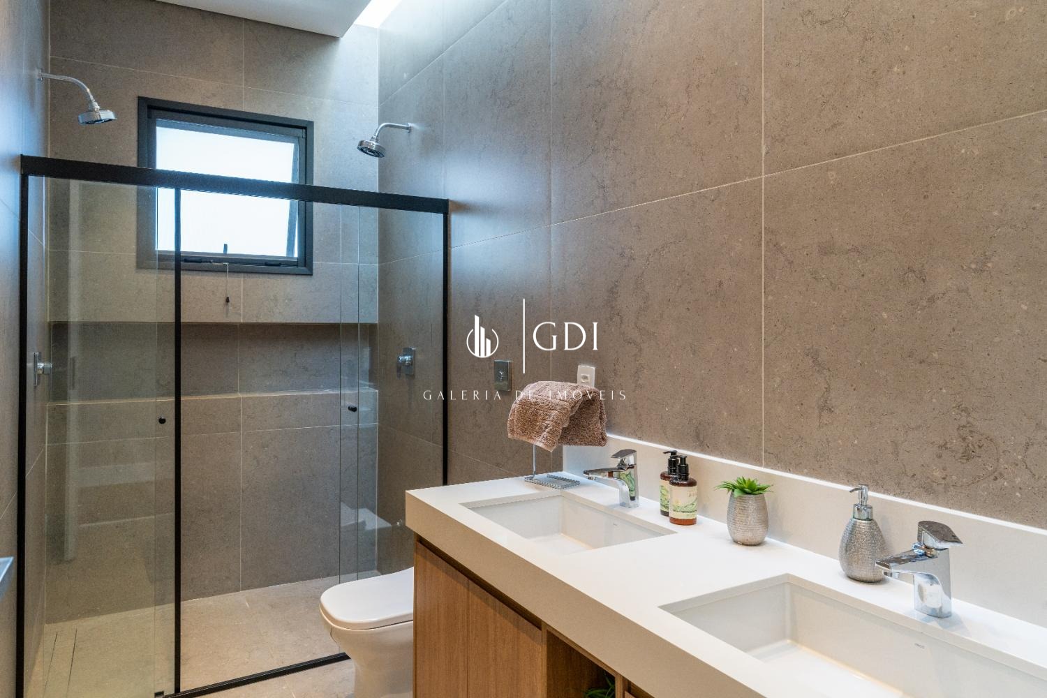 Banheiro master com duas cubas e dois chuveiros