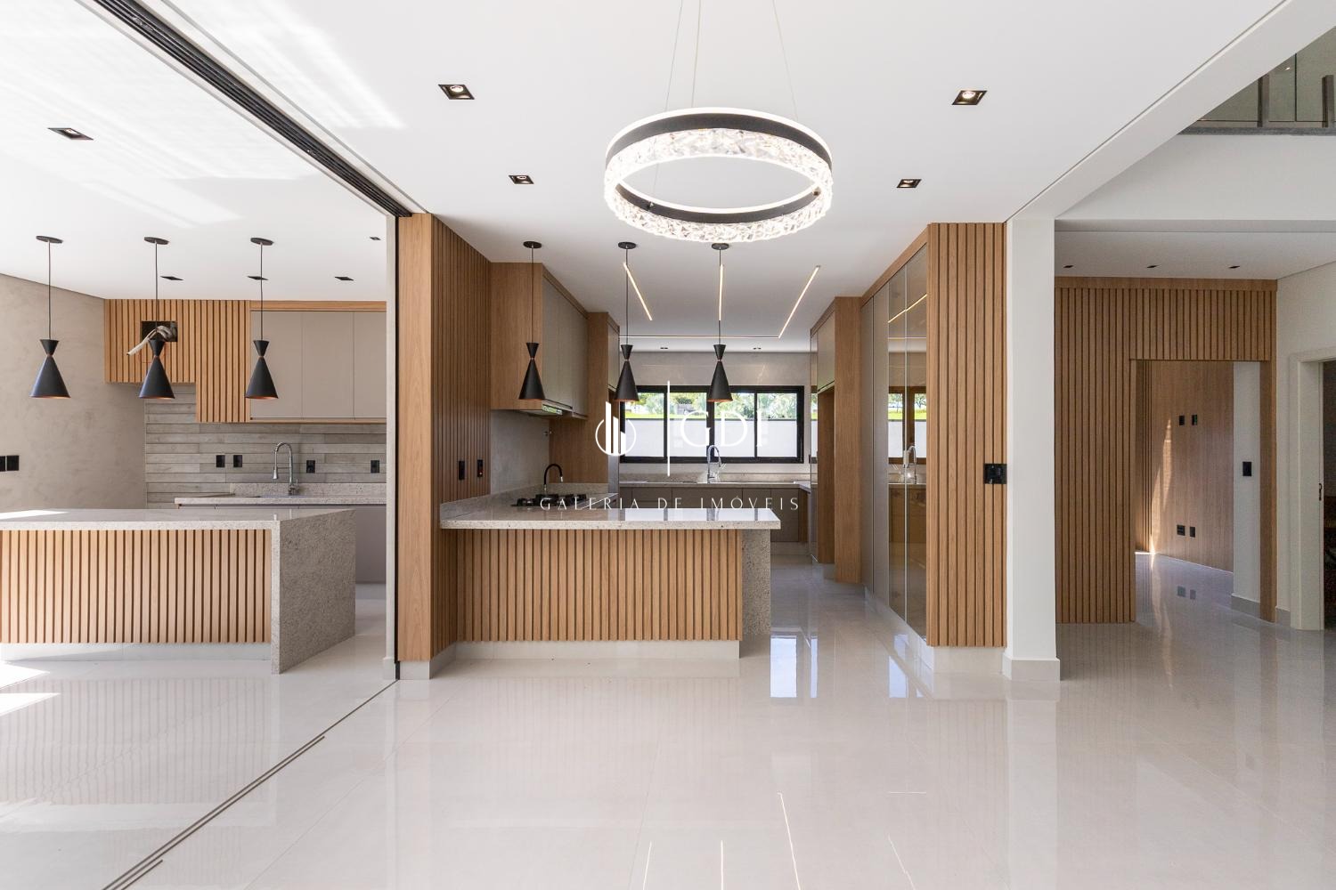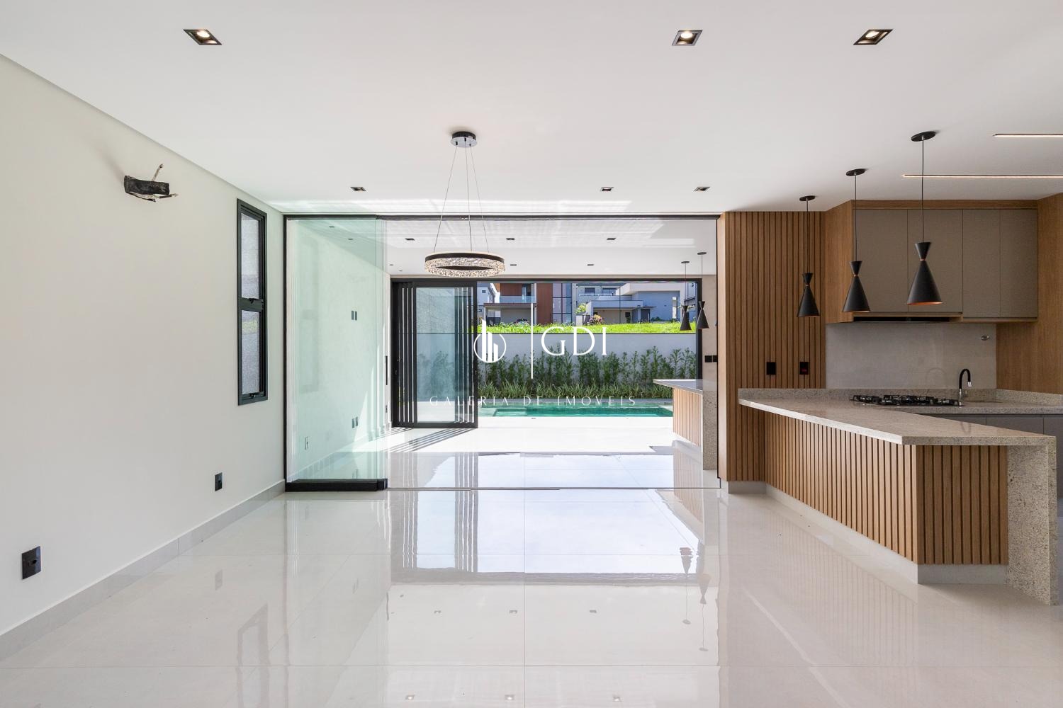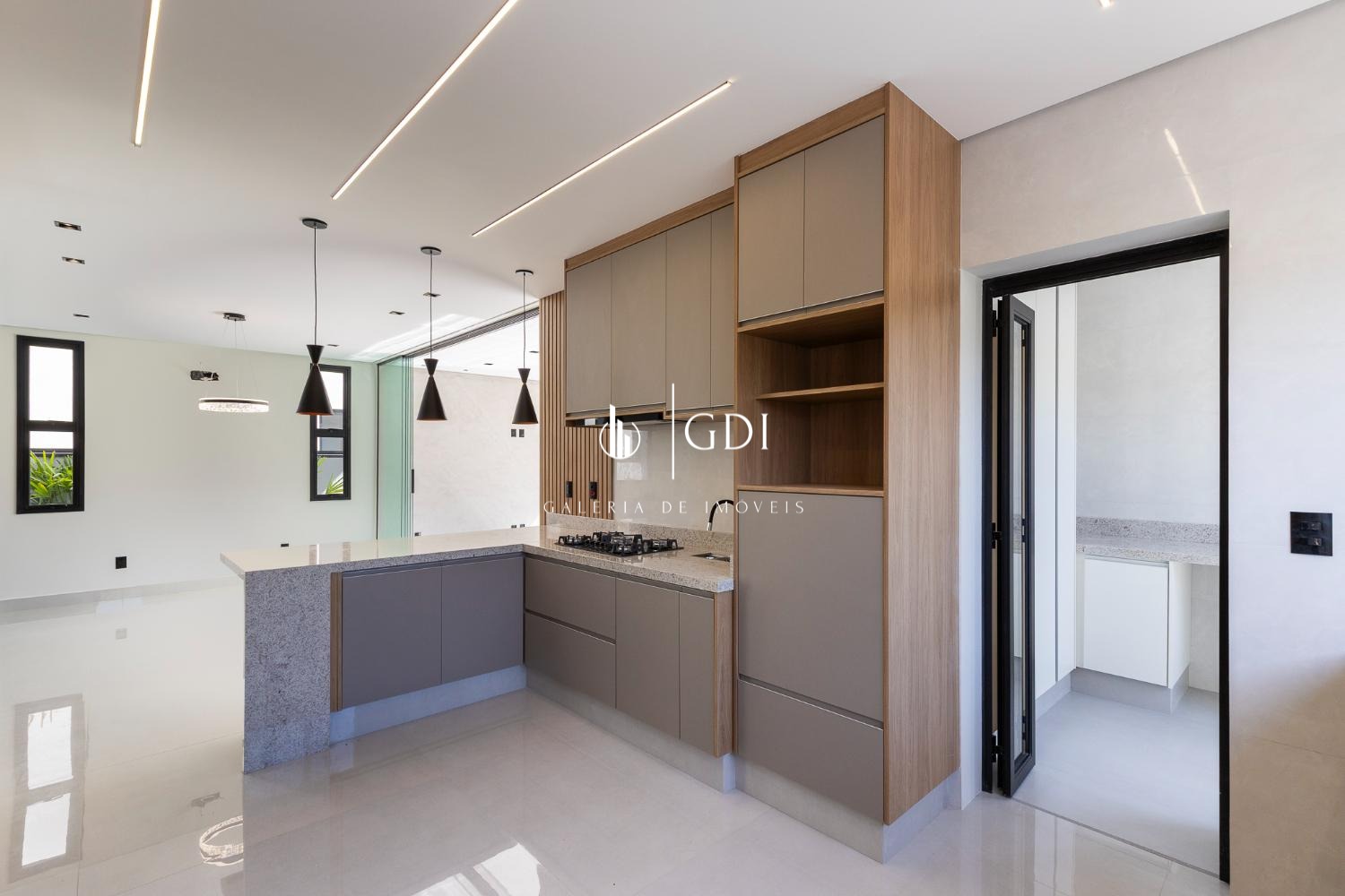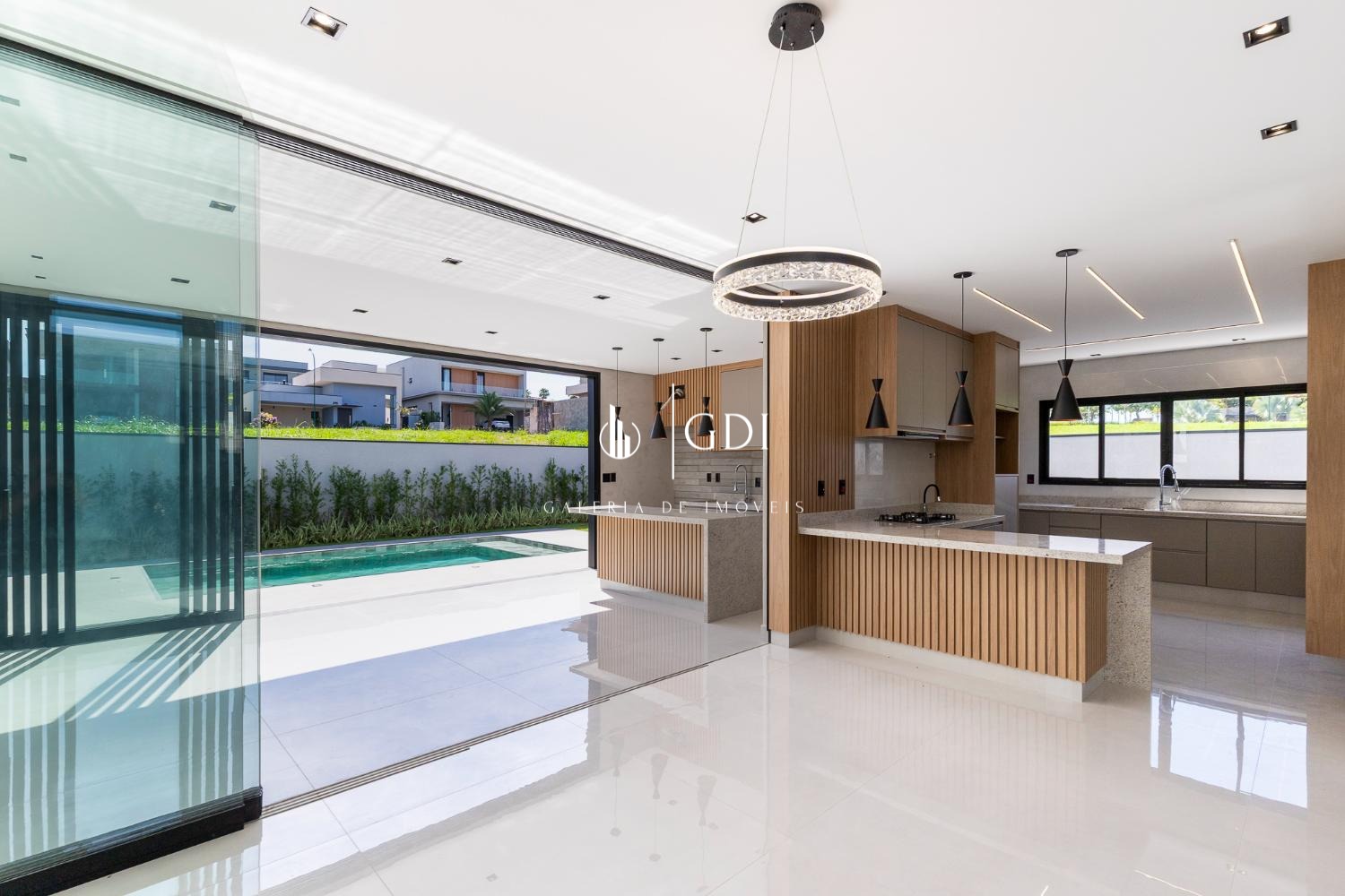 Cozinha ampla integrada ao gourmet, com fechamento por porta de vidro deslizante