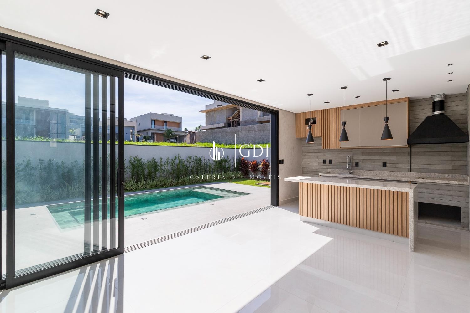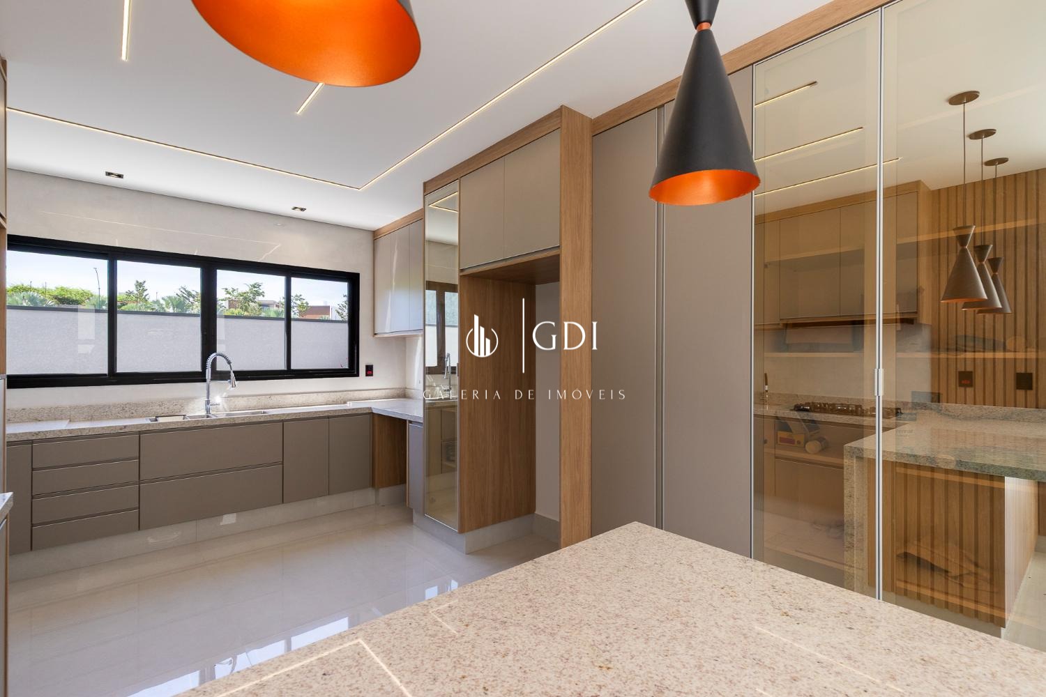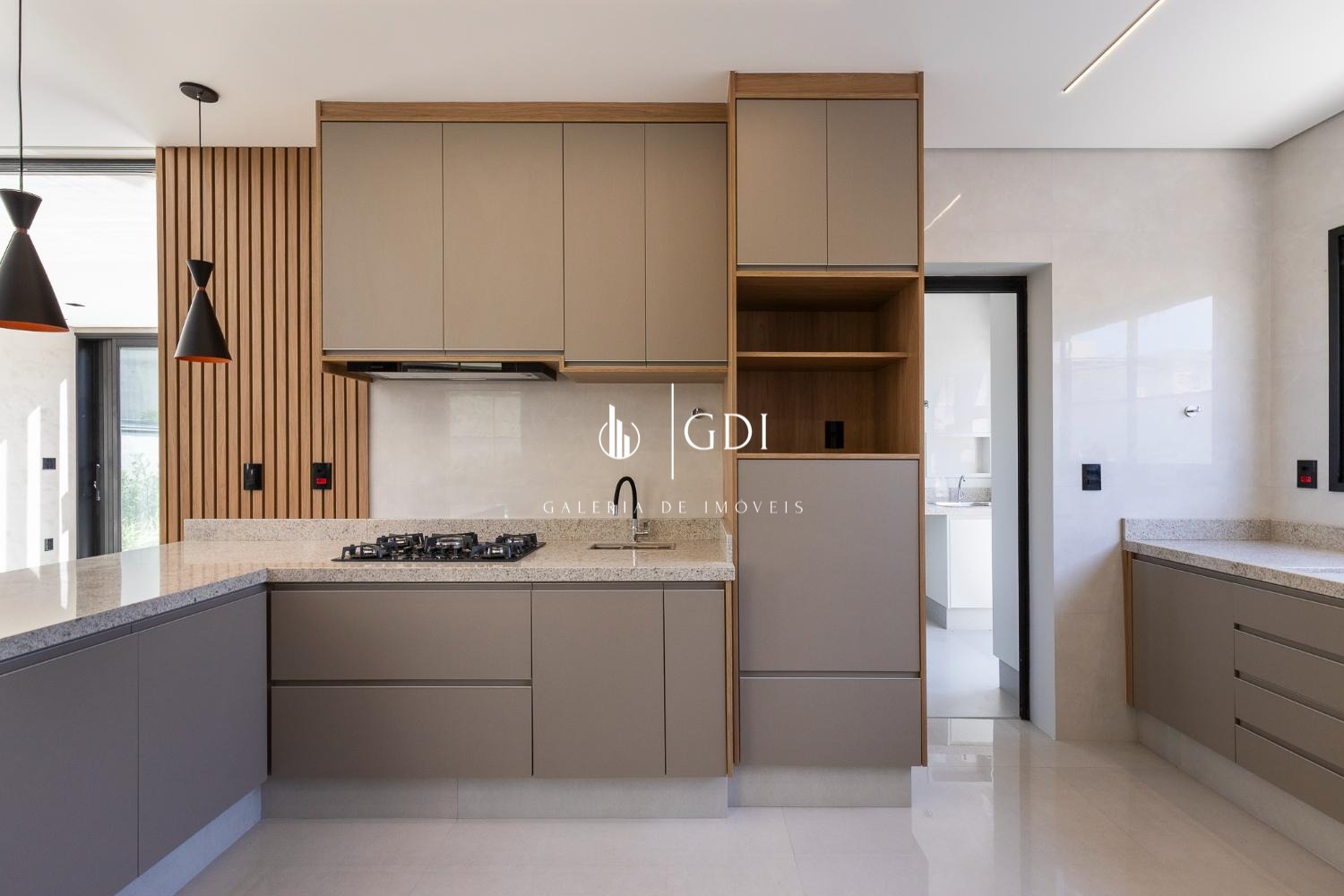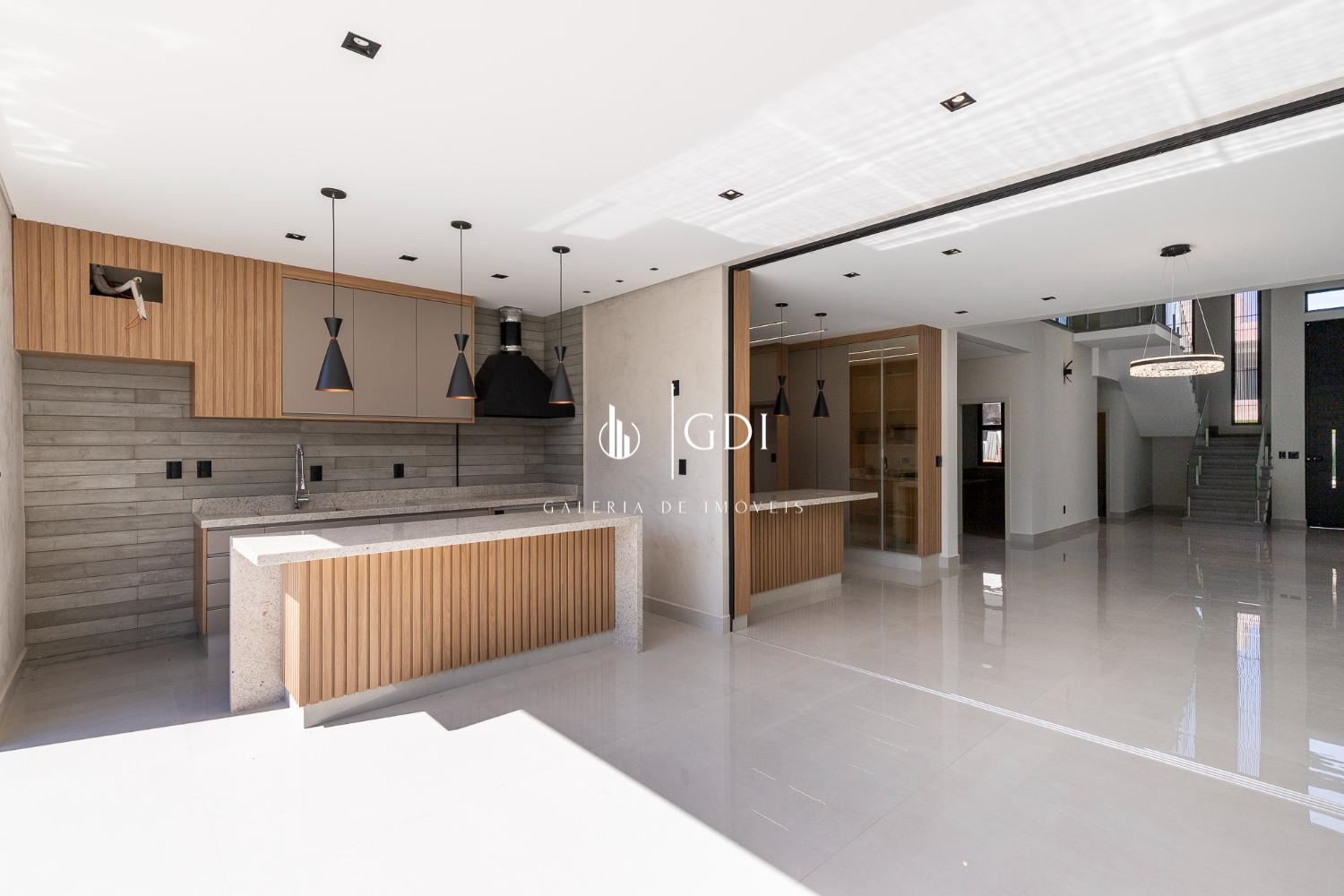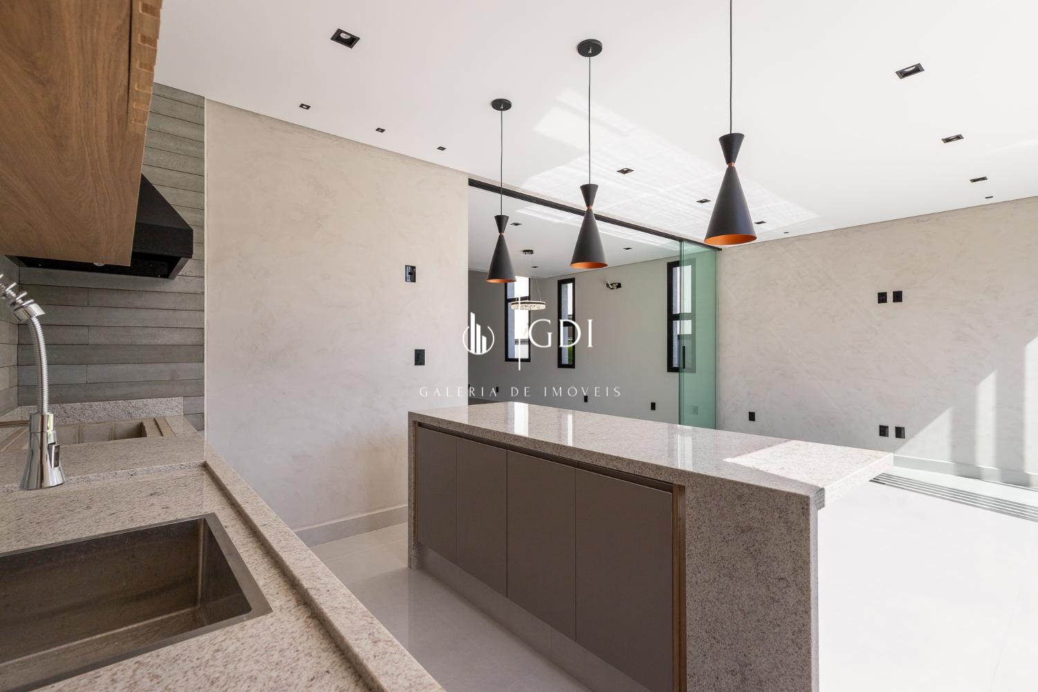 Cozinha ampla integrada ao gourmet, com fechamento por porta de vidro deslizante