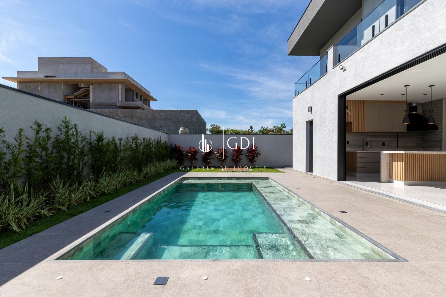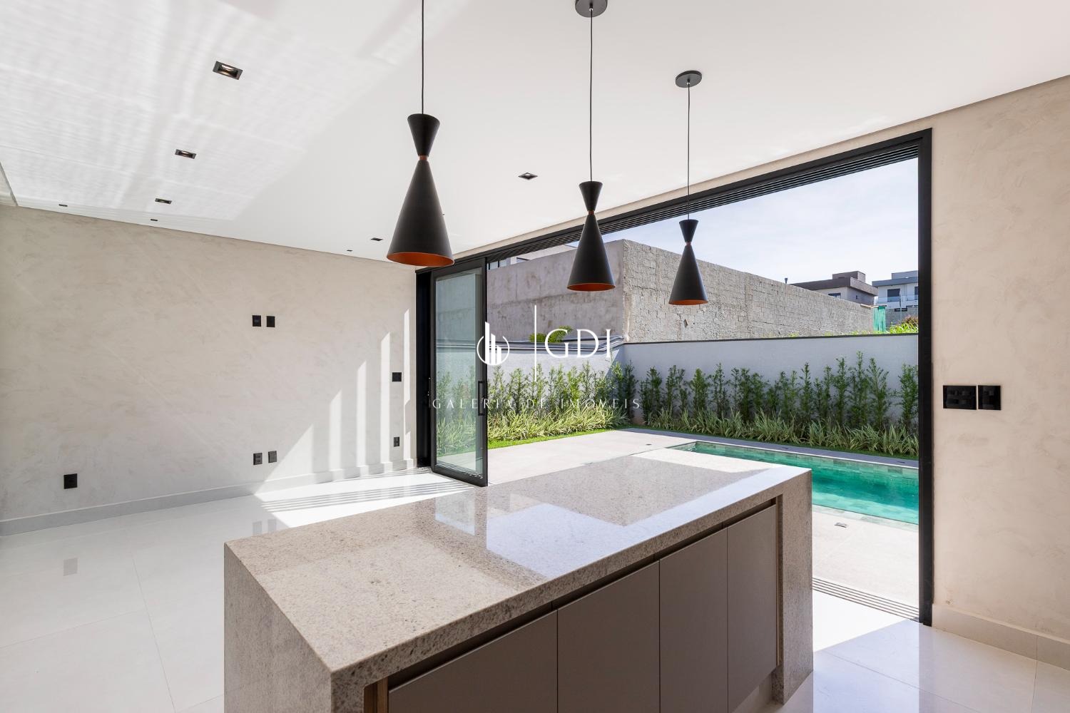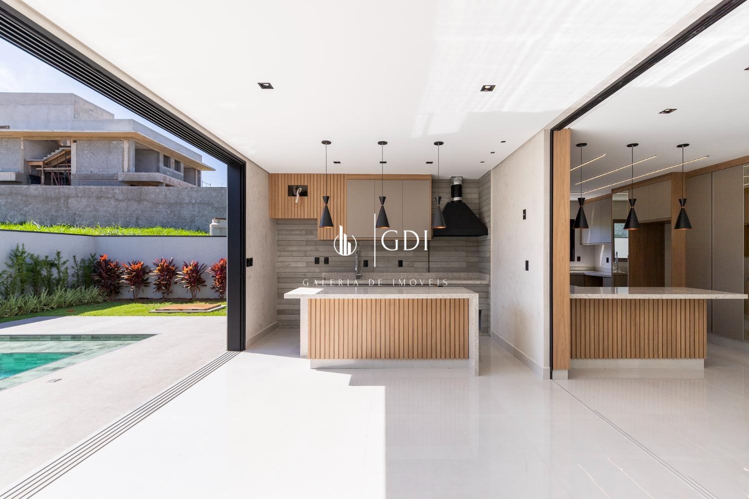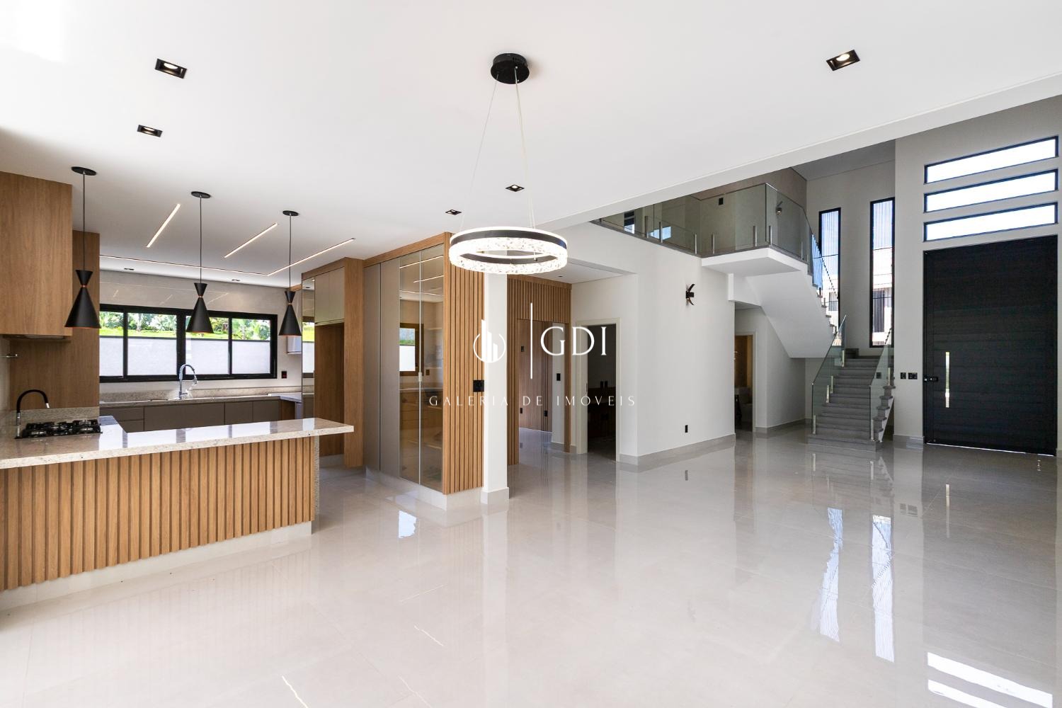 Cozinha ampla integrada ao gourmet, com fechamento por porta de vidro deslizante