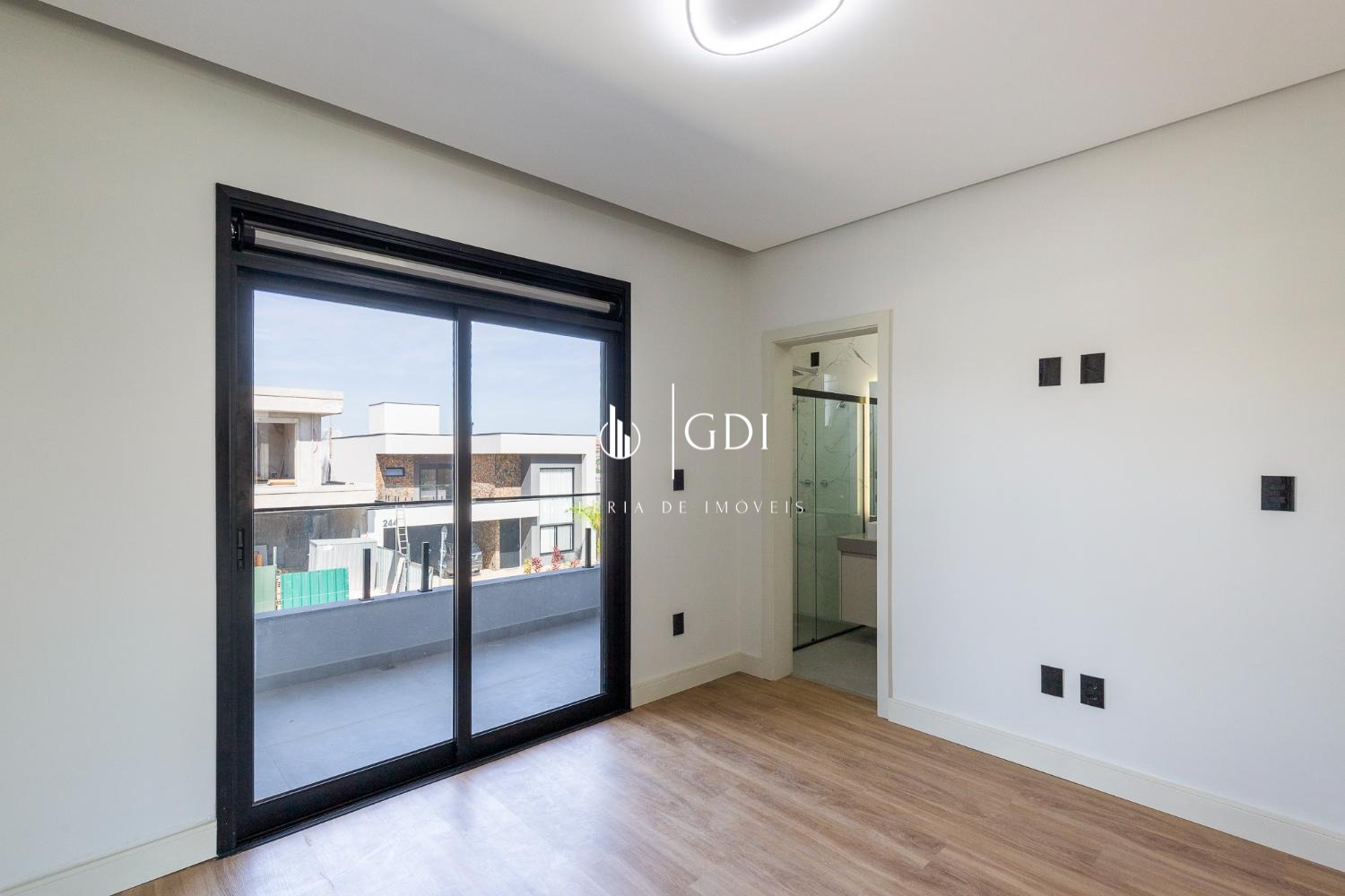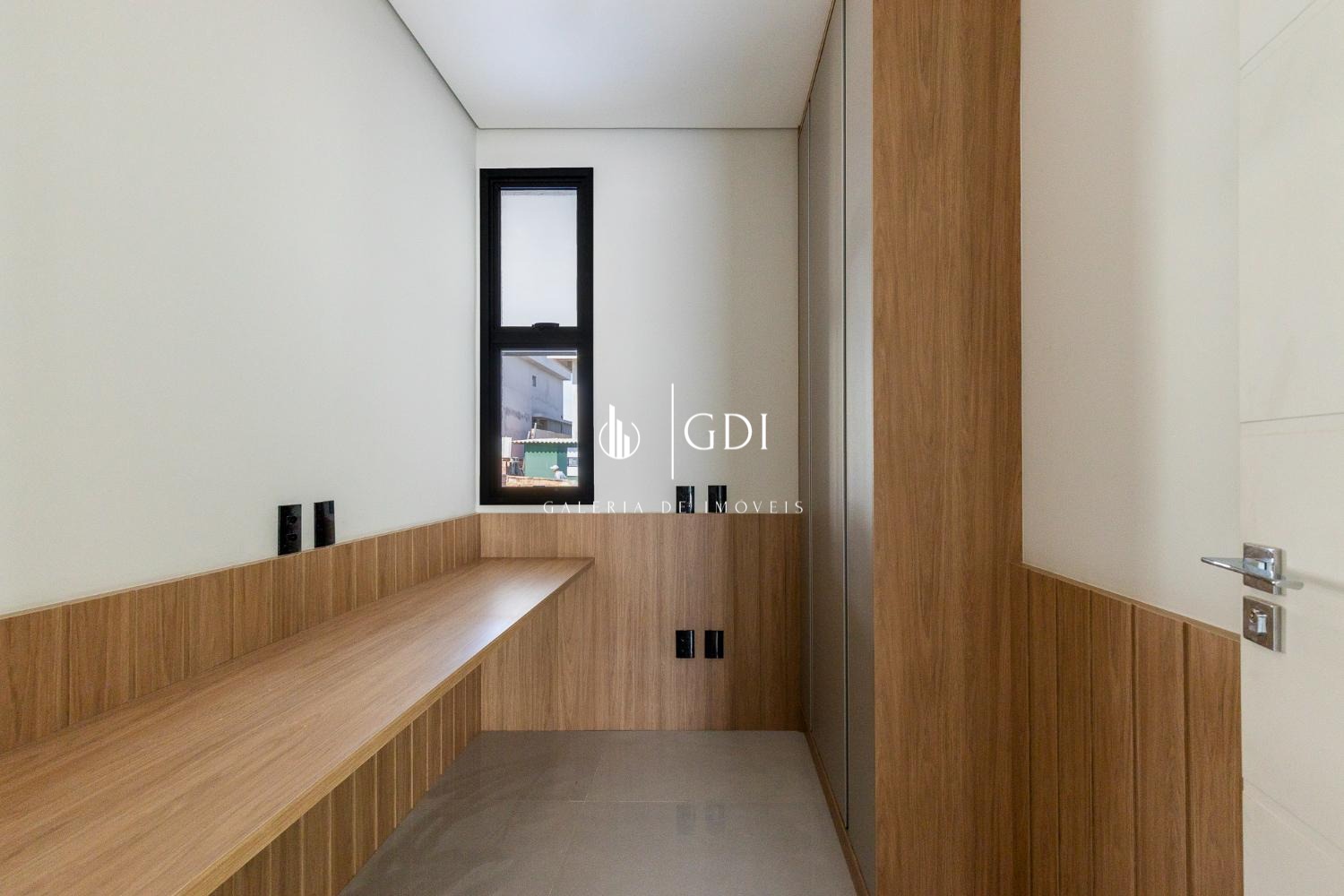 Sala de home reversível para suíte, com porta deslizante ripada e painel com porta invisível para o WC