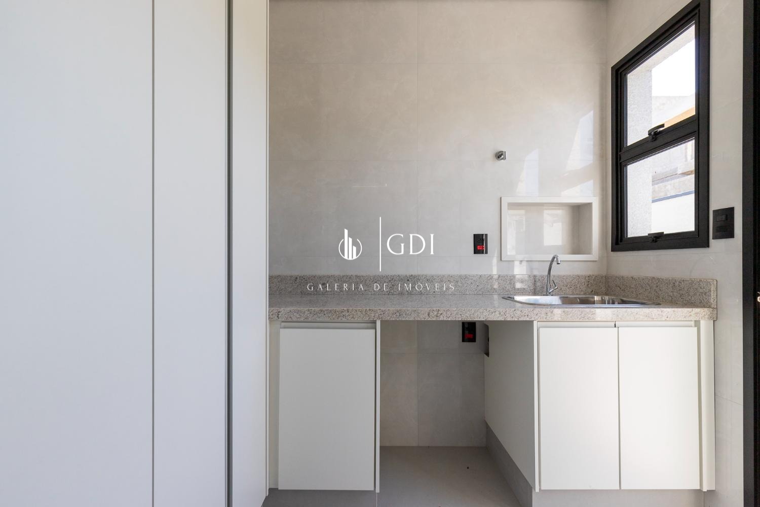 Área de serviço com bancada em pedra, tanque inox embutido e armários planejados