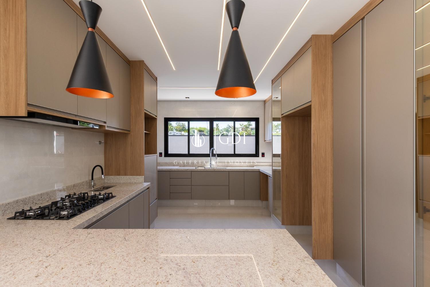 Cozinha e espaço gourmet completos em marcenaria planejada, com cooktop e coifa